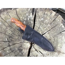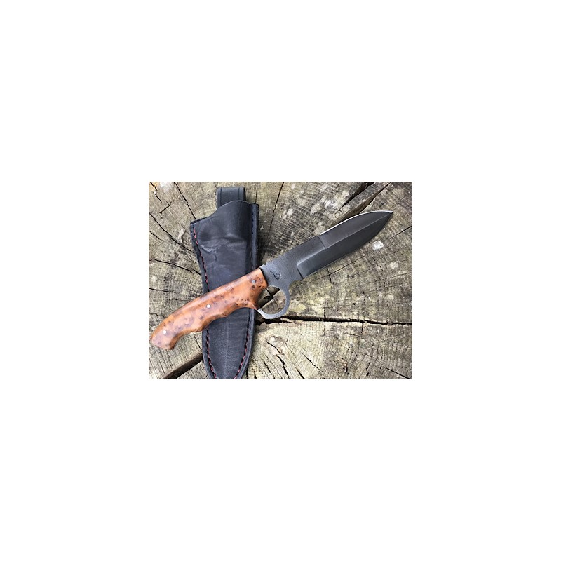 Manche en thuya du Maroc sur intercalaires rouges, offrant une prise en main agréable et sécuritaire, étui en cuir moulé, tannage végétal, couture point sellier á la main