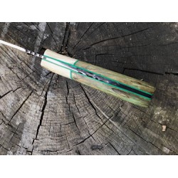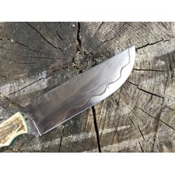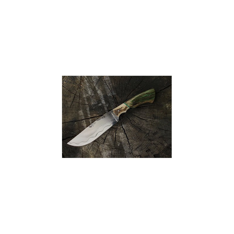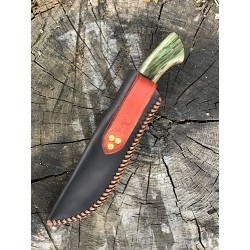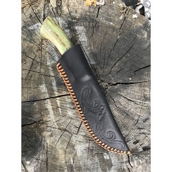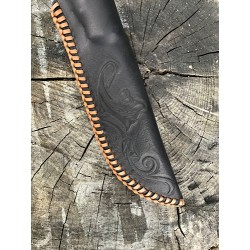 Le West bowie est un couteau utilitaire et de plein air, polyvalente et robuste, en acier carbone DNH7, émouture plate intégrale et trempe sélective, lame patinée à l’acide, manche en bouleau échauffé et stabilisé et mitre en bois de cerf sur intercalaire rouge. Guillochage sur le dos de manche. Magnifique étui en cuir avec un motif Repoussé à la main et un laçage type mexicain en cuir